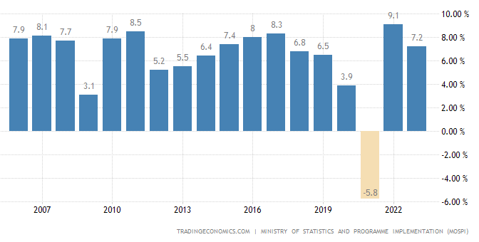 கடந்த பத்து வருட காலத்தில் பொருளாதார வளர்ச்சியை காணுகையில், 2021-22ம் நிதியாண்டில் அதிகபட்சமாக 9.1 சதவீத வளர்ச்சி பெற்றுள்ளது. இது 2020ம் ஆண்டின் கொரோனா பெருந்தொற்றுக்கு பிறகான காலமாகும். அதாவது கொரோனா ஊரடங்கு காலத்தில்(2020-21) நாட்டின் பொருளாதாரம் 5.8 சதவீதம் வீழ்ச்சி கண்டிருந்தது.