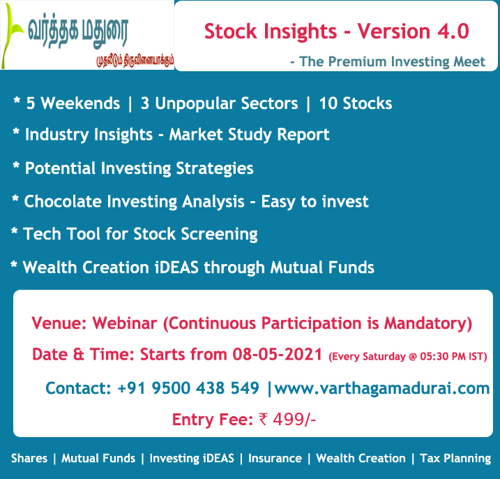 சுமார் 6000க்கும் மேற்பட்ட சந்தாதாரர்கள் நமது தளத்தை பின் தொடர்ந்து வருவது கவனிக்கத்தக்கது. இதுவரை வர்த்தக மதுரை இணையதள பக்கத்தில் தனிநபர் நிதி சார்ந்த பல கட்டுரைகளை (650க்கும் மேற்பட்ட பதிவுகள்) நீங்கள் படித்திருப்பீர்கள். தற்போது இணைய வழி நேரடி தொடர்பில்(Webinar) உங்களுக்கான நிதி சார்ந்த கேள்விகள் மற்றும் சந்தேகங்களை நீங்கள் கேட்கலாம்.