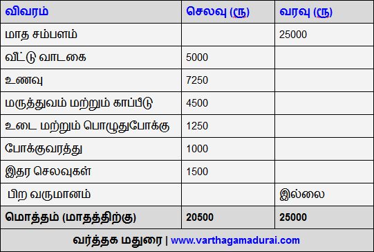 பட்ஜெட் திட்டமிடலில் உங்கள் அத்தியாவசிய செலவுகளை, வருமானத்தில் 50 சதவீதத்திற்குள் இருக்குமாறு பார்த்து கொள்ளுங்கள். அது போல உங்கள் குறுகிய கால மற்றும் நீண்ட கால விருப்பங்களுக்கான செலவுகளை மாத வருமானத்தில் 30 சதவீதத்திற்கு மிகாமல் பார்த்து கொள்ளுங்கள். எஞ்சிய 20 சதவீதம் உங்கள் சேமிப்பு மற்றும் முதலீடாக இருக்க வேண்டும். சேமிப்பும், முதலீடும் எதிர்காலத்திற்கான செலவுகள் என்பதனை மறக்க வேண்டாம்.