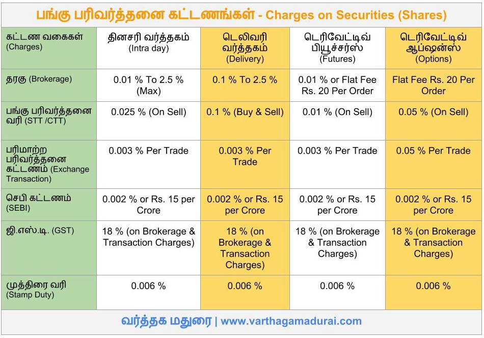 பங்குகளை பொறுத்தவரை நாம் வாங்குவது (Buy Shares) என்பது ஒரு பரிவர்த்தனை (Trade) ஆகும். அதே போன்று, விற்பதும் ஒரு பரிவர்த்தனையாக கொள்ளப்படுகிறது. இந்த பரிவர்த்தனைகளுக்கு ஏற்றாற் போல், தரகு கட்டணம் (Brokerage) மற்றும் இதர சேவை கட்டணங்கள் வசூலிக்கப்படுகின்றன. தினசரி வர்த்தகத்திற்கு (Equity Intra day) என ஒருவித கட்டண முறையும், பங்குகளை  இன்று வாங்கி விட்டு, மறுநாளோ அல்லது எதிர்வரும் காலங்களில் விற்பதன் (Equity Delivery) மூலமான பரிவர்த்தனைகளுக்கு மற்றொரு விதமாக கட்டணங்கள் விதிக்கப்படுகின்றன. டெரிவேட்டிவ்ஸ் (Derivatives – Futures & Options) என்ற சொல்லக்கூடிய ஆபத்தான வர்த்தகத்திற்கு என கட்டணங்கள் வேறுபடுகின்றன. பொதுவாக பங்கு பரிவர்த்தனைகளுக்கு தரகரின் (Stock Broker) தரகு கட்டணம், சந்தை அமைப்பின் பங்கு பரிவர்த்தனை கட்டணம் (Securities Transaction Tax – STT), பரிமாற்ற கட்டணம் (Exchange Transaction Charges), செபி கட்டணம் (SEBI Turnover), ஜி.எஸ்.டி மற்றும் முத்திரை வரி (Stamp Duty) வசூலிக்கப்படுகிறது.